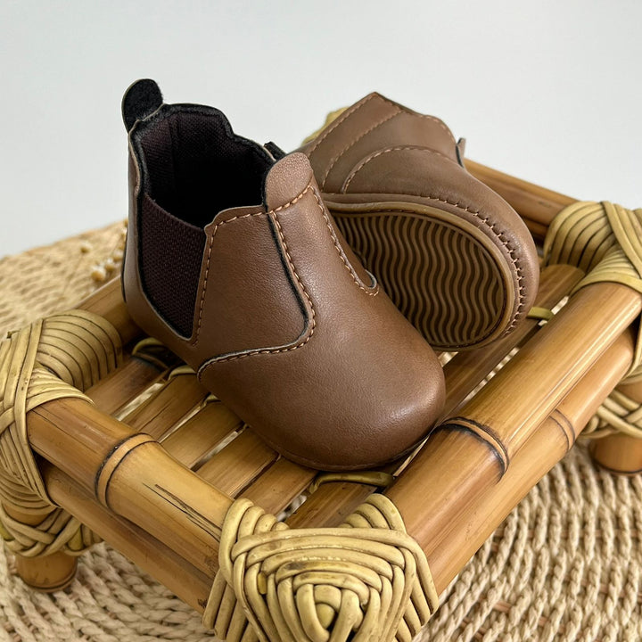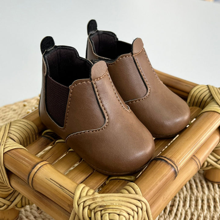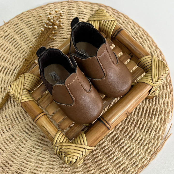 Bota em couro na cor marrom, delicada e confortável. Perfeito para bebês de 2 a 12 meses. Com solado de borracha macio e flexível.