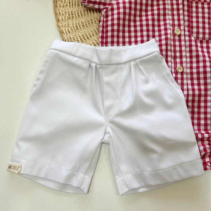 O short branco complementa o look com um visual limpo e sofisticado, possuindo cós elástico na parte de trás que garante conforto e liberdade de movimento. Juntos, formam um conjunto harmonioso, ideal para as celebrações de Natal e registros em família.