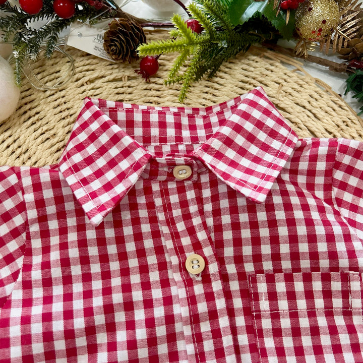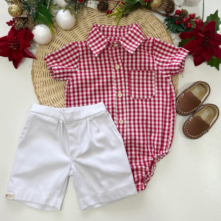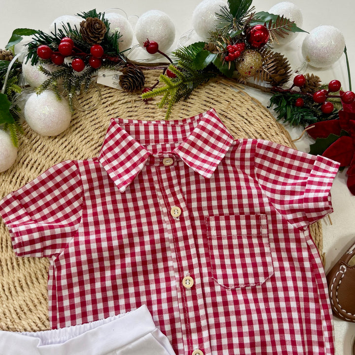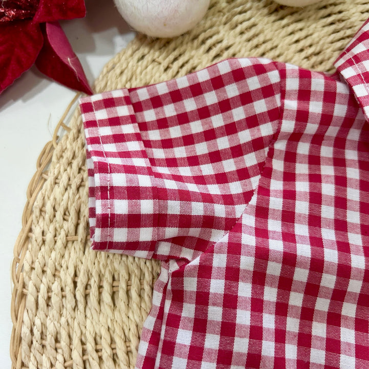 O body estilo camisa traz estampa xadrez em vermelho e branco, gola tradicional e botões frontais em madeira que conferem um ar refinado e festivo. O bolso frontal adiciona um toque delicado, enquanto a abertura inferior com botões de pressão facilita o vestir e a troca.