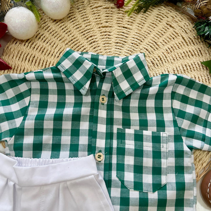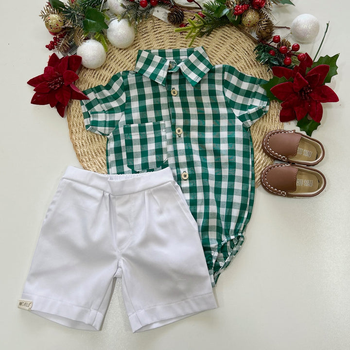 Confeccionado em tricoline 100% algodão, o tecido garante leveza e suavidade, perfeito para os dias de festa. O body estilo camisa traz estampa xadrez em verde e branco, gola tradicional e botões frontais que conferem um ar refinado e festivo. O bolso frontal adiciona um toque delicado, enquanto a abertura inferior com botões de pressão facilita o vestir e a troca.
