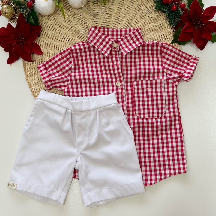 A camisa de manga curta, em xadrez vermelho e branco, traz um ar clássico e natalino, com fechamento por botões de madeira frontais e bolsinho que adiciona charme e delicadeza ao visual.
