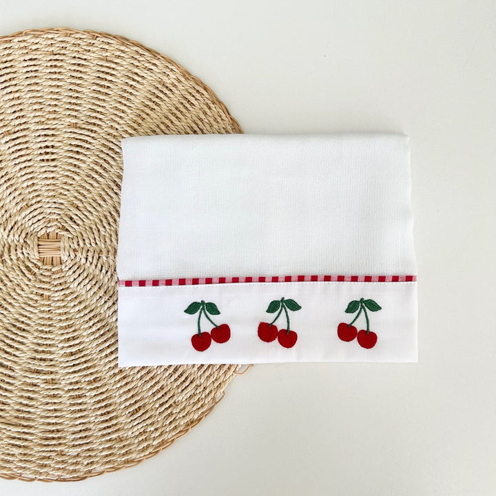 A Fralda Grande Cerejinha traz bordados encantadores com cerejas vermelhas e acabamento em vichy vermelho — uma combinação charmosa, atemporal e cheia de personalidade.