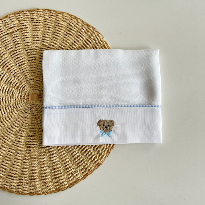 A Fralda Grande Ursinho traz bordados encantadores com ursinho de gravata e acabamento em vichy azul — uma combinação charmosa, atemporal e cheia de personalidade.
