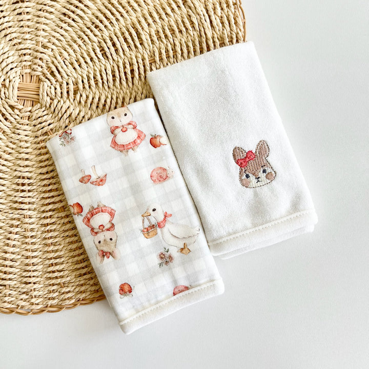 Um dos paninhos é produzido em tecido atoalhado macio com bordado protegido de ursinha, garantindo maior absorção.
