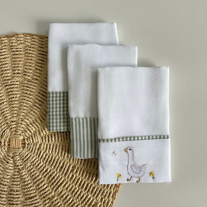 O Kit Paninhos de Boca Patinha traz um mix encantador de estampas: vichy verde, listras verde delicado e o bordado de patinha. Um trio perfeito para acompanhar os momentos mais doces da rotina do bebê.