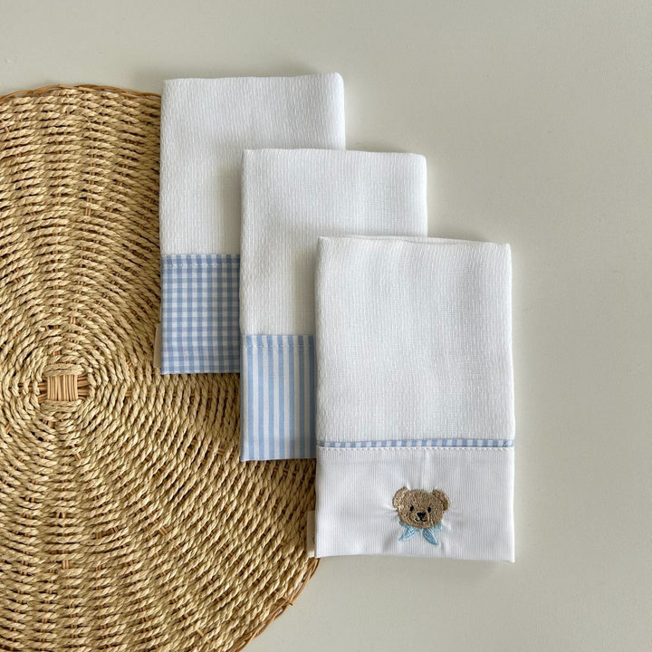 O Kit Paninhos de Boca Ursinho traz um mix encantador de estampas: vichy azul, listras delicado e o bordado de ursinho. Um trio perfeito para acompanhar os momentos mais doces da rotina do bebê.