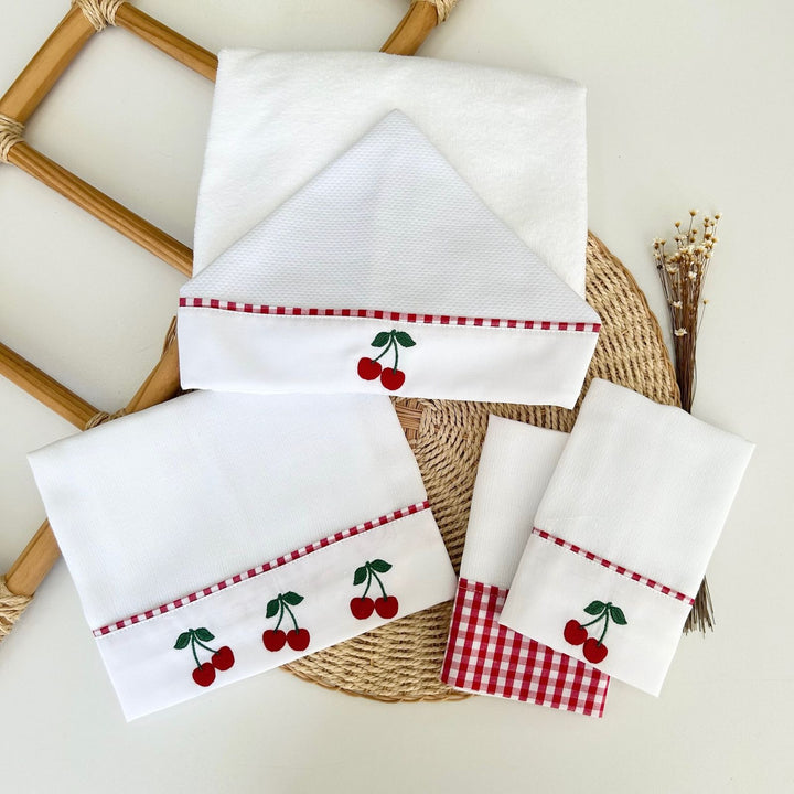 Confeccionado com fralda Cremer e tecidos 100% algodão premium, o Kit Maternidade Cerejinha une conforto, qualidade e um visual encantador com bordados exclusivos de cerejinhas e detalhes em vichy vermelho.