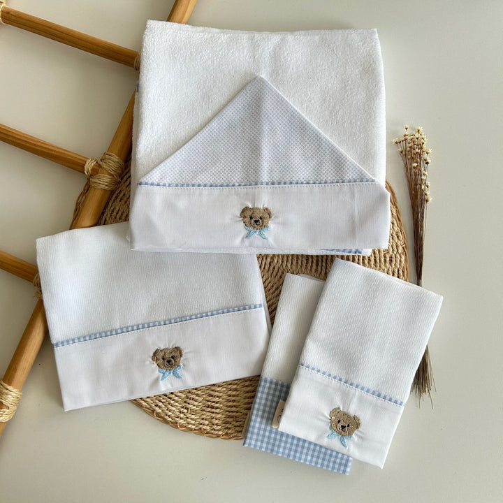 Os bordados de ursinho e o acabamento em xadrez azul trazem um toque lúdico e atemporal que encanta à primeira vista.