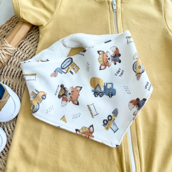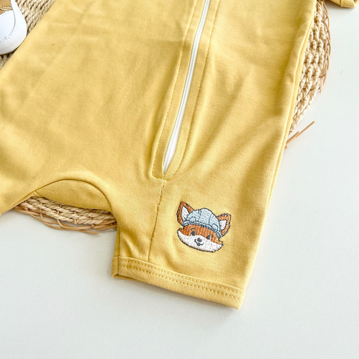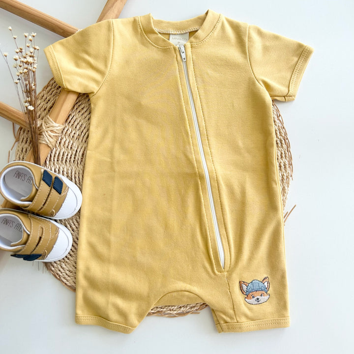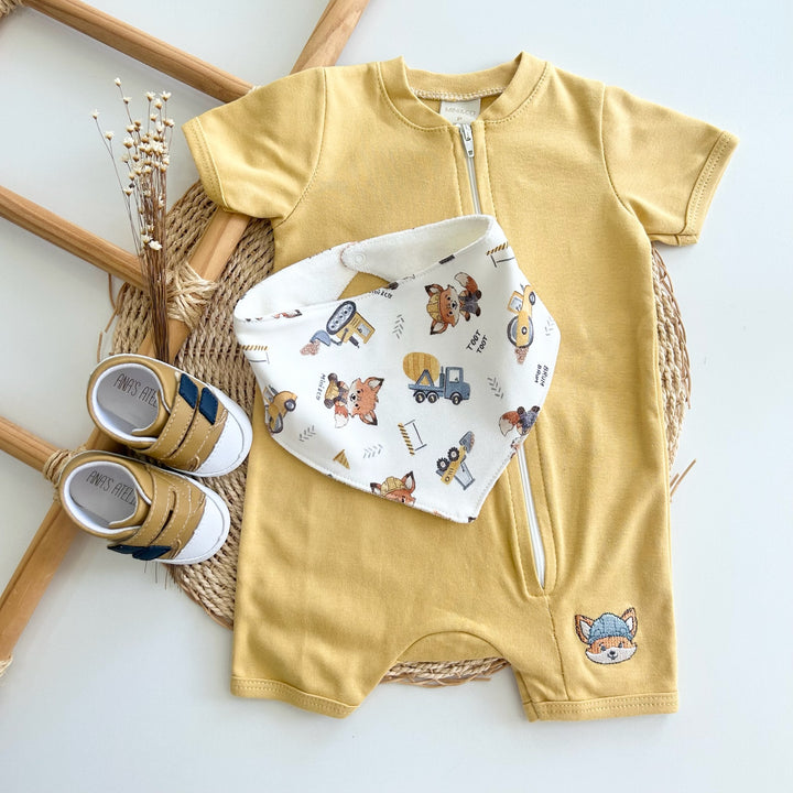 Romper Mostarda com Zíper + Babador Bandana – Coleção Raposinha