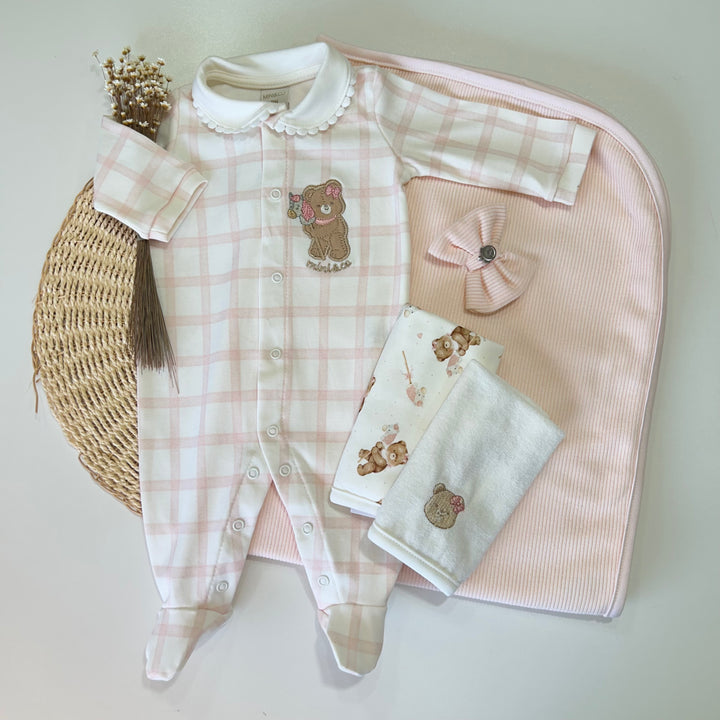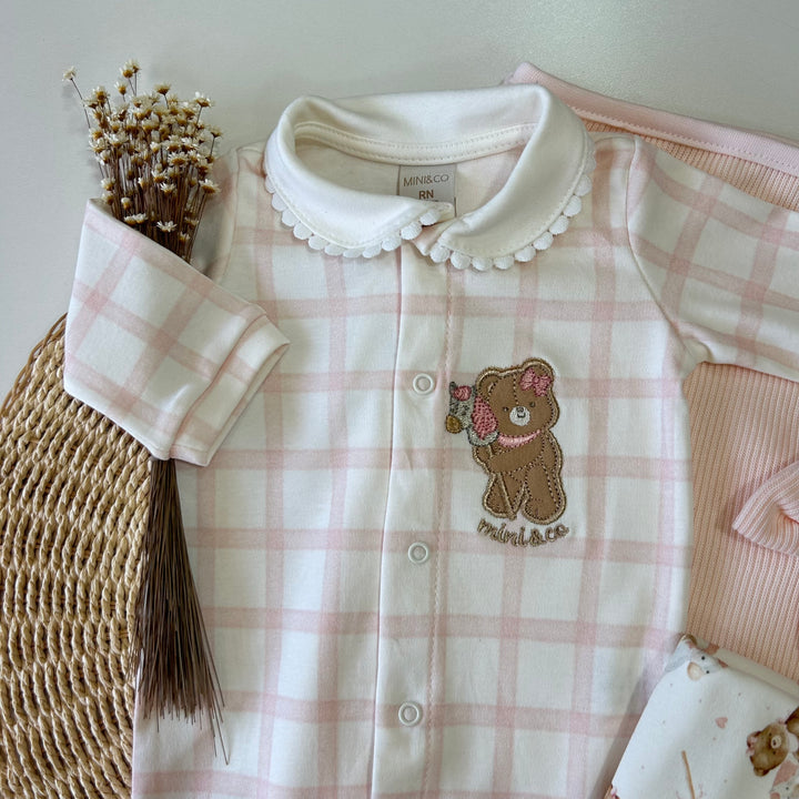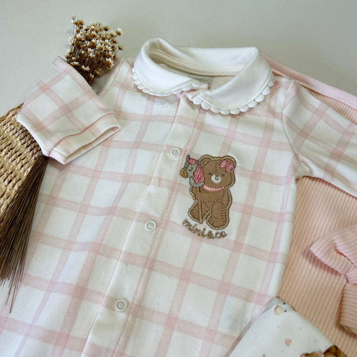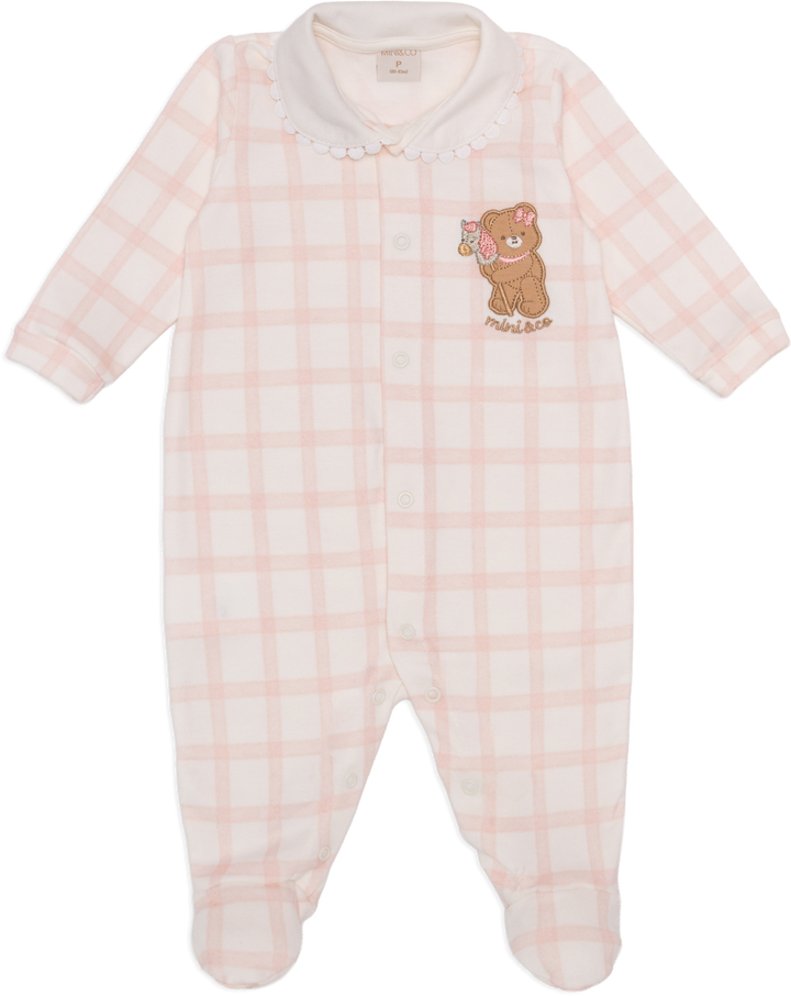 Macacão Longo Com Gola Xadrez Rosa - Ursinha e Cavalinho