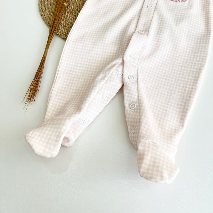 Seu design exclusivo traz a estampa xadrez em tom rosado e um bordado protegido de cachorrinha com laço rosa, que transmite delicadeza e charme. A gola branca com acabamento de mini babadinhos adiciona um detalhe sofisticado e atemporal, deixando o visual ainda mais especial.