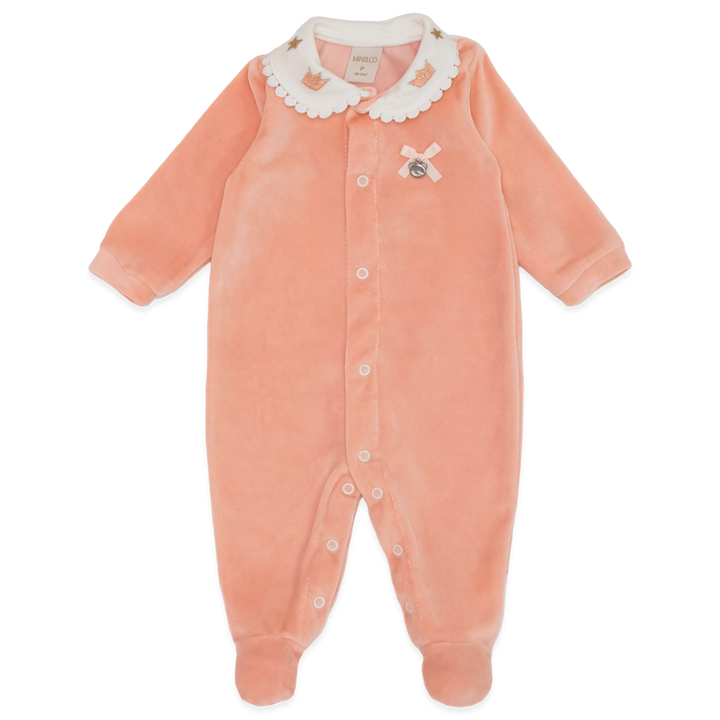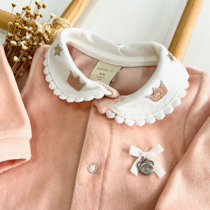 Macacão confeccionado em plush macio e quentinho, perfeito para os dias mais frios. O toque suave do tecido proporciona aconchego e proteção para a pele delicada do bebê. Destaque para a gola bordada com coroas e estrelinhas douradas e o lacinho delicado no peitinho, que tornam a peça ainda mais encantadora.