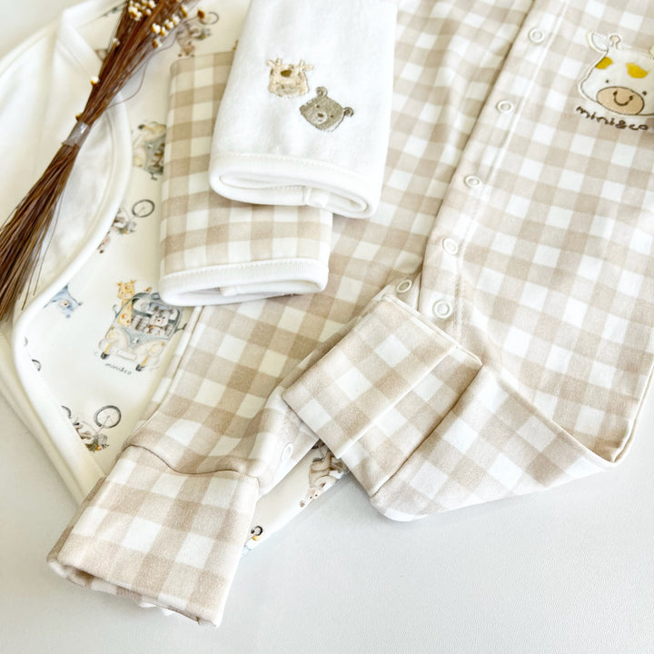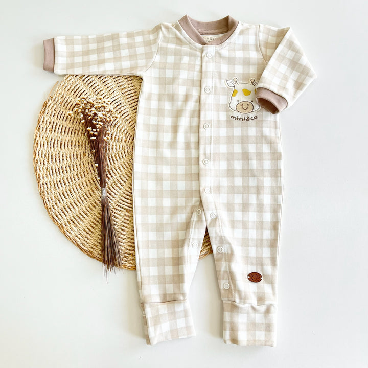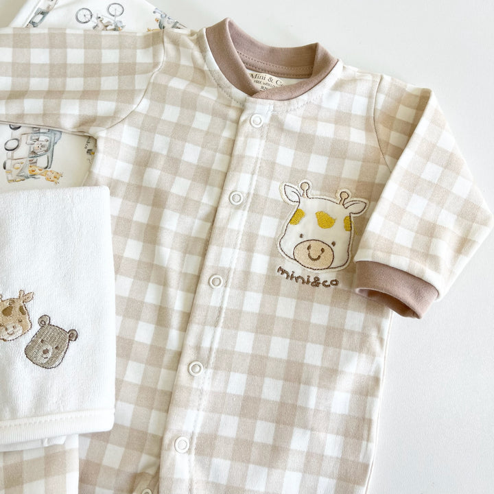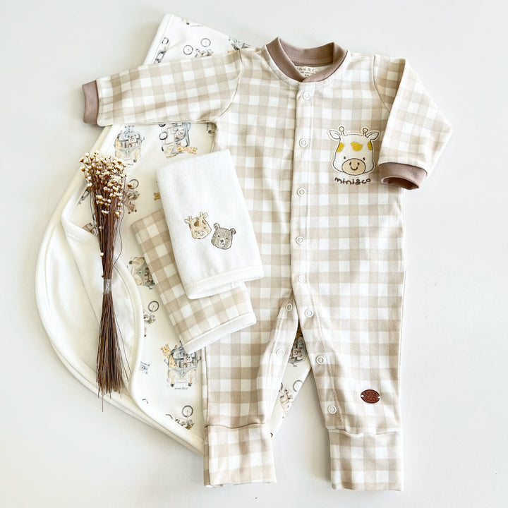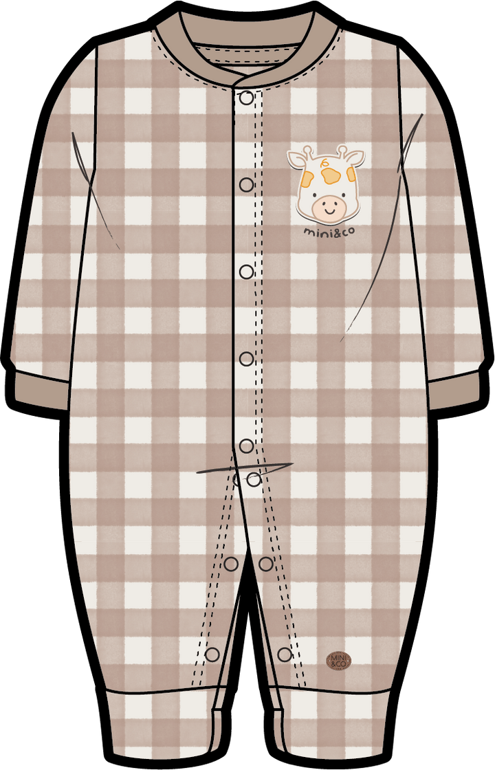 Com estampa xadrez em tom bege suave, a peça transmite sofisticação e delicadeza, enquanto o bordado protegido de girafinha sorridente adiciona um toque lúdico e encantador, característico da coleção Bichinhos e Transporte.