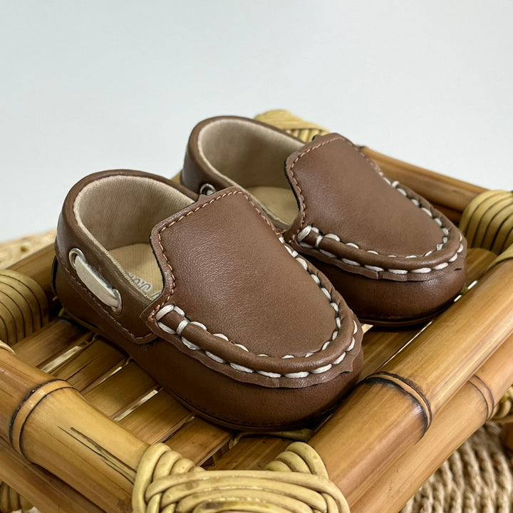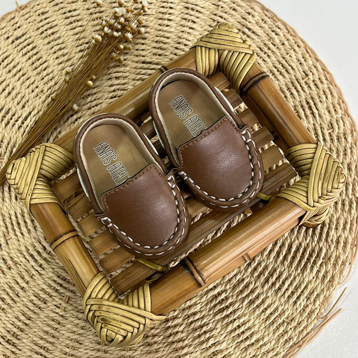 Mocassim na cor marrom , delicado e confortável. Perfeito para bebês de 2 a 12 meses. Solado de borracha macio e flexível