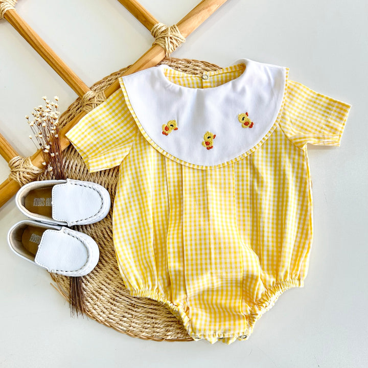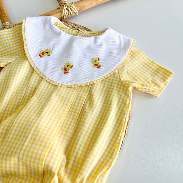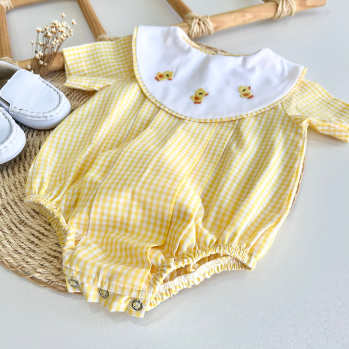 O Romper Pintinhos é uma peça unissex, cheia de charme e personalidade, pensada para vestir os pequenos com elegância e conforto desde os primeiros meses. Confeccionado em tricoline xadrez amarelo e branco 100% algodão, traz leveza e frescor para o dia a dia ou ocasiões especiais.