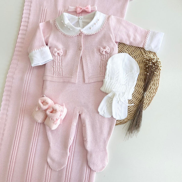 Um charme atemporal com detalhes que encantam. A Saída de Maternidade Laço Rosa é composta por macacão com efeito de casaquinho falso, calça pezinho e manta coordenada, todos em tricot rosa claro com aplicações delicadas de laços em relevo. A gola branca bordada com mini pérolas completa o visual com romantismo e elegância.