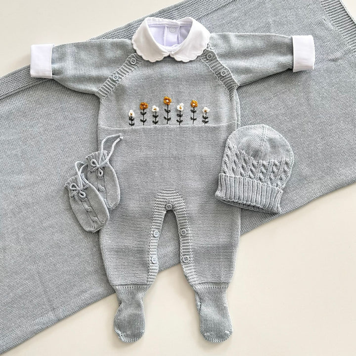 A saída de maternidade em tricot azul claro é composta por macacão com pezinho fechado e manta coordenada, com aplicação manual de flores bordadas em alto-relevo na frente, trazendo um toque de cor, leveza e sofisticação.
