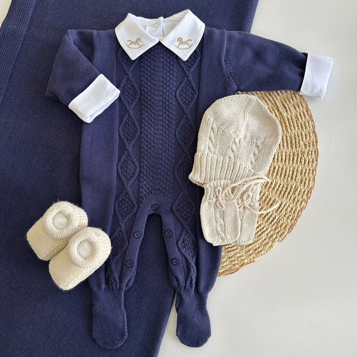 A Saída de Maternidade Losango Azul Marinho é composta por macacão com trama losango central em relevo e manta coordenada, ambos em tricot azul marinho – uma escolha sofisticada e atemporal para a chegada do bebê.