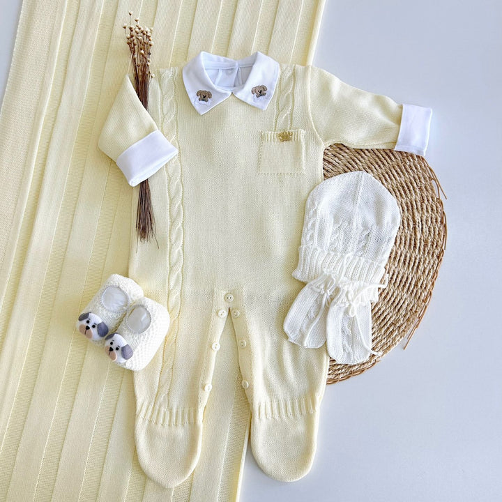 Clássica, charmosa e com um toque lúdico, a Saída de Maternidade Príncipe Amarela é composta por macacão em tricot com trama delicada nas laterais, bolsinho decorativo e manta coordenada, ambos em amarelo claro, ideal para meninos.