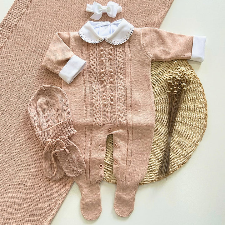 Delicadeza e aconchego definem essa saída de maternidade em tricot, composta por macacão com pezinho fechado e manta coordenada, ambos na suave tonalidade salmão macacão conta com detalhes florais trabalhados na frente proporcionando, um toque clássico e atemporal para os primeiros dias do bebê.