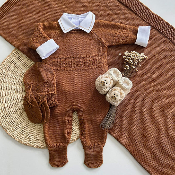 Acolhimento com estilo em cada ponto. Essa saída de maternidade une a beleza do tricot artesanal ao charme da cor caramelo, uma escolha moderna e cheia de personalidade. A composição inclui macacão com pezinho fechado e manta coordenada, com trama delicada na frente e nas mangas.