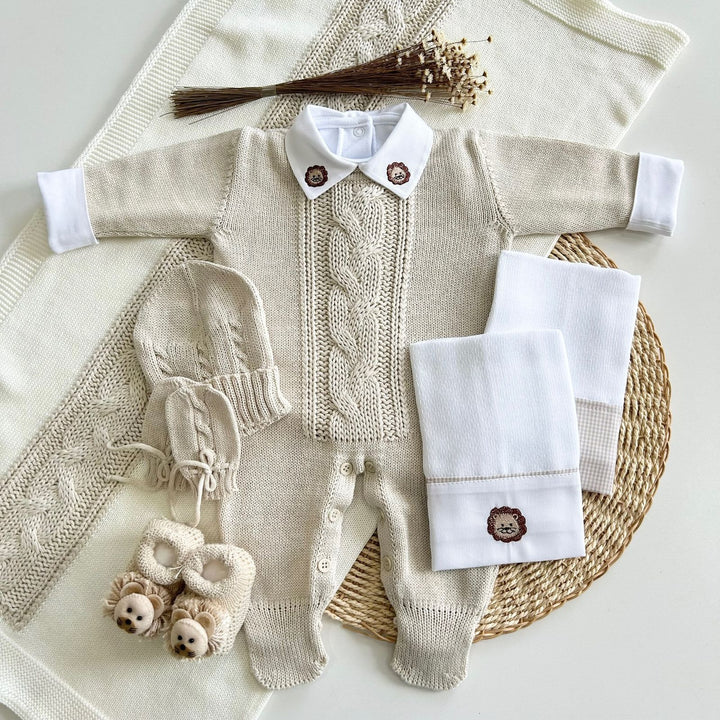 Composta por macacão em tricot bege e manta bicolor coordenada, o modelo possui trança central em relevo e acabamento impecável. A proposta neutra e sofisticada combina perfeitamente com o momento de chegada do bebê.
