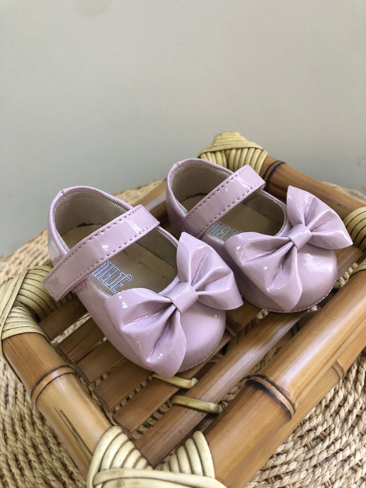 Sapatilha com laço, na cor rosê com verniz. solado super macio, flexível e confortável com fechamento lateral por velcro.