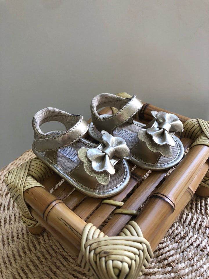 Sandália, na cor dourada com laço, solado super macio, flexível e confortável com fechamento lateral por velcro.