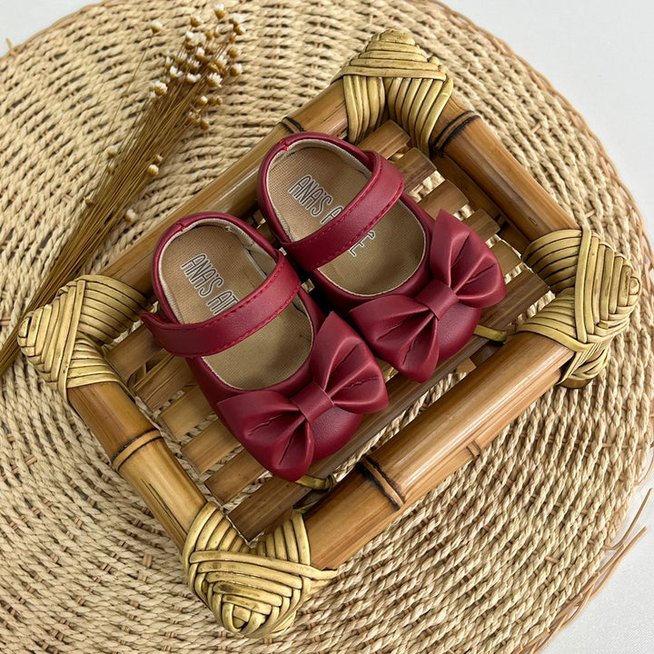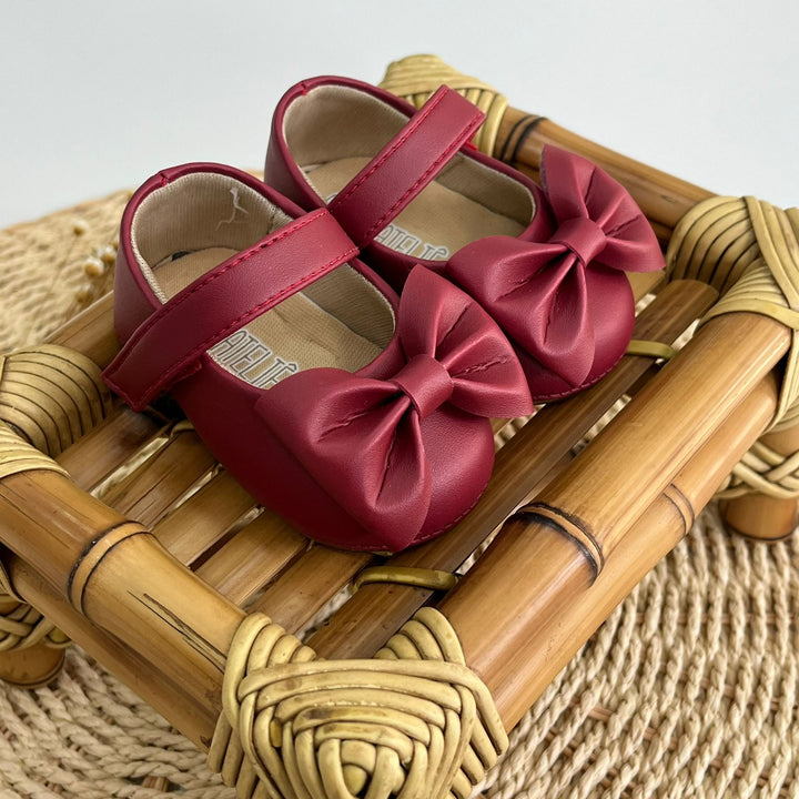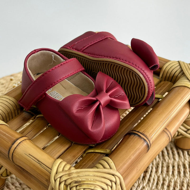 Sapatilha de boneca em cor marsala, delicada e confortável. Perfeita para bebês de 2 a 12 meses. Solado de borracha macio e prático fecho de velcro.