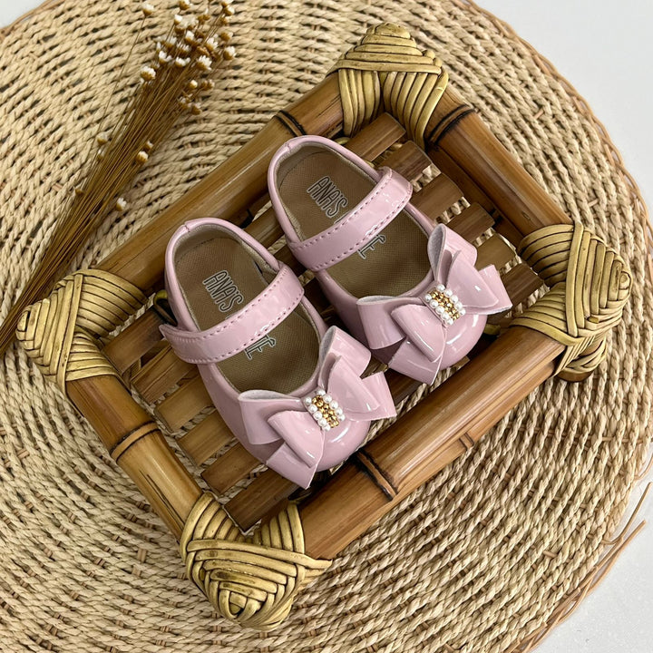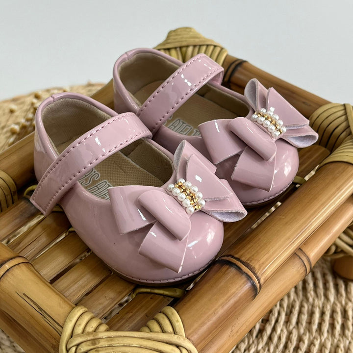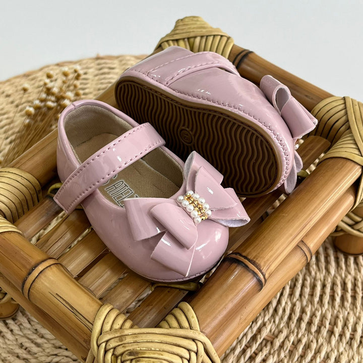 Sapatilha boneca com verniz na cor rosê, delicada e confortável. Perfeita para bebês de 2 a 12 meses. Solado de borracha macio e prático fecho de velcro.
