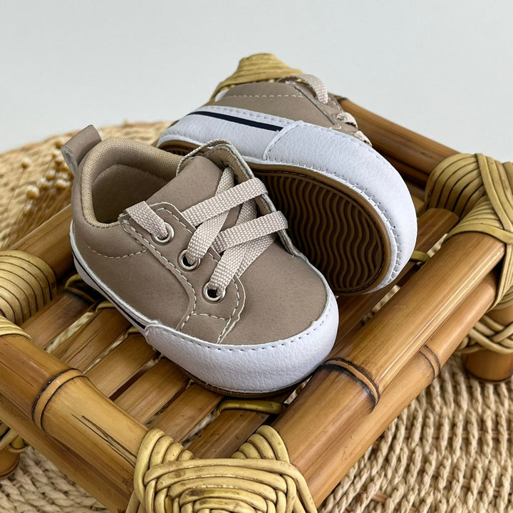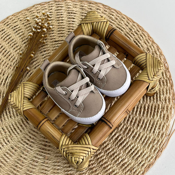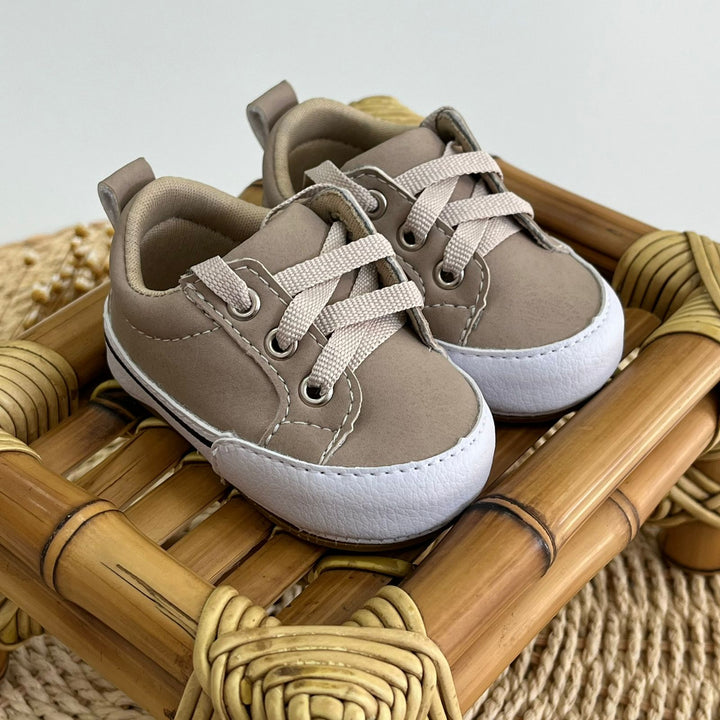 Tênis em couro na cor bege, delicado e confortável. Perfeito para bebês de 2 a 12 meses. Solado de borracha e macio flexível