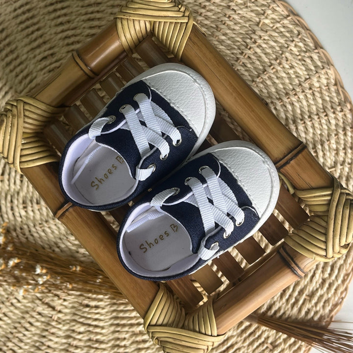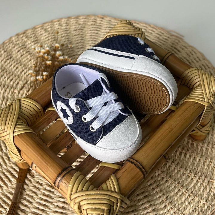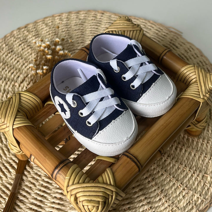 Tênis em lona na cor azul marinho com aplique de estrela, delicado e confortável. Perfeito para bebês de 2 a 12 meses. Solado de borracha e macio.