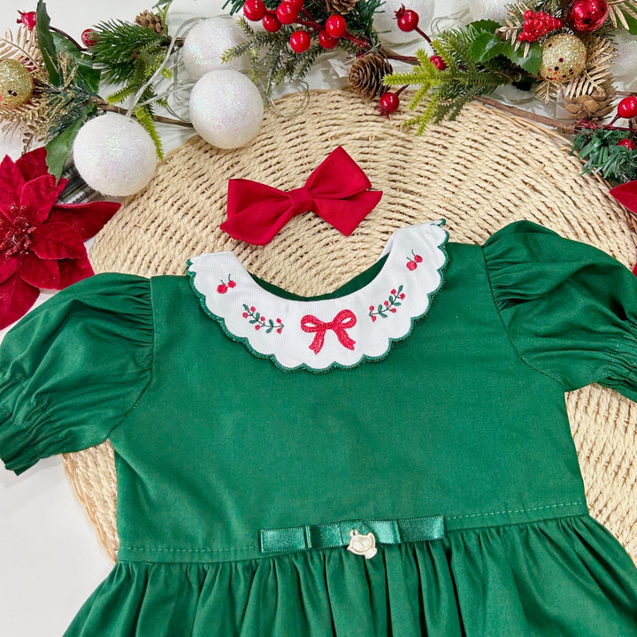 A gola redonda bordada em festonê com raminhos e laço no centro traduz a atmosfera natalina com riqueza de detalhes, enquanto o pequeno laço na cintura, com pingente dourado do nosso passarinho, adiciona um toque de charme e elegância.